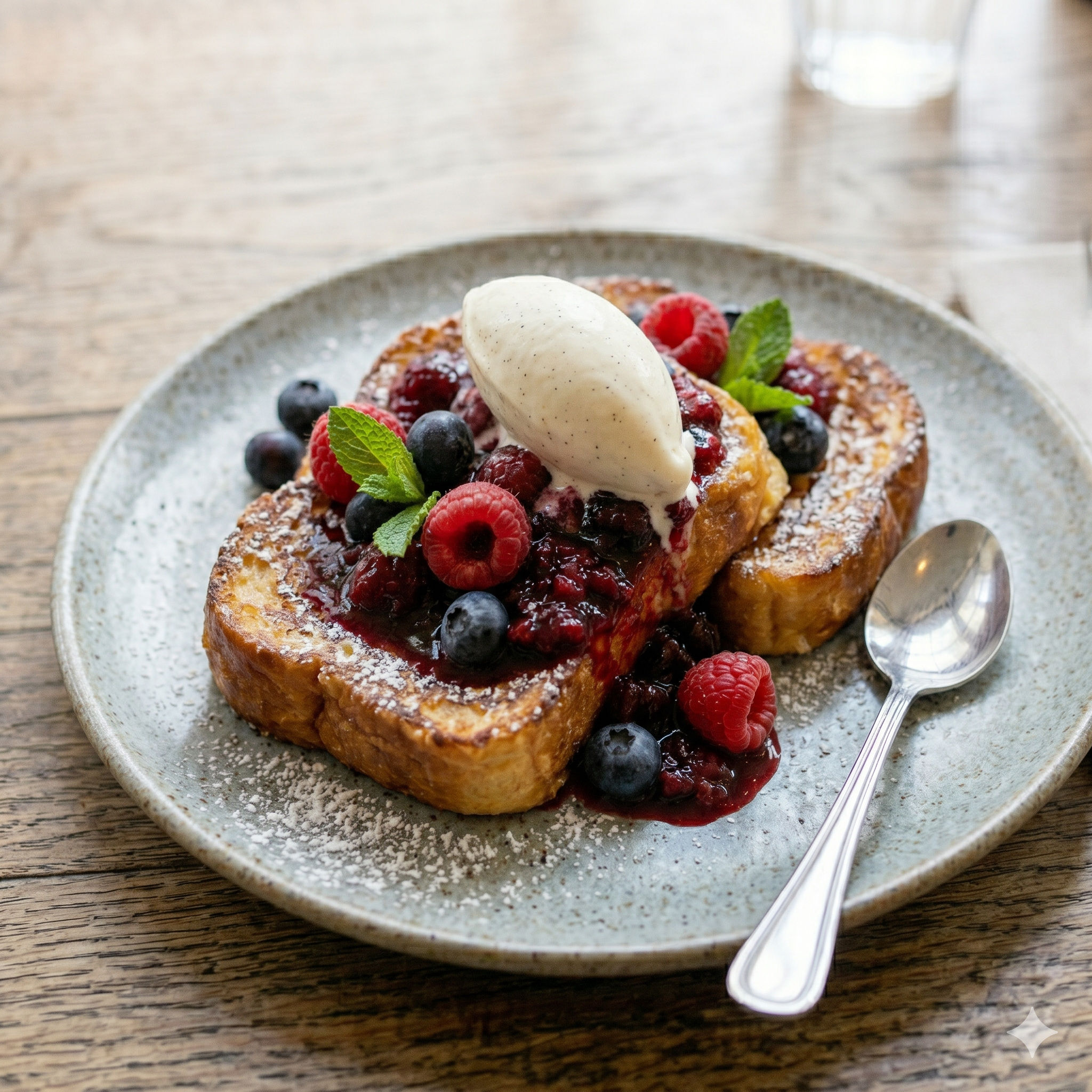 Tostadas francesas doradas y esponjosas, acompañadas de mermelada de frutos rojos y un toque de helado artesanal que aporta frescura y un contraste perfecto entre lo cálido y lo dulce.