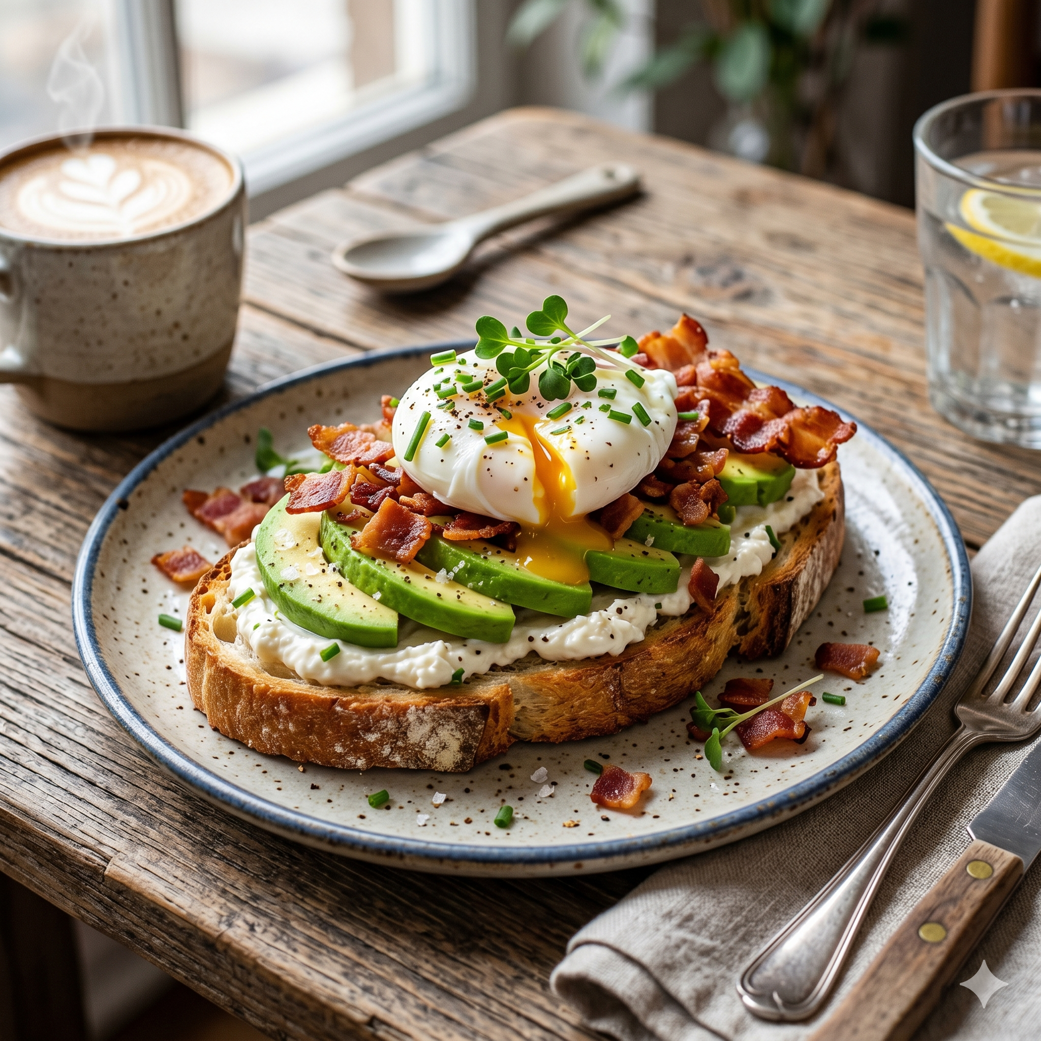 Pan de masa madre tostado, cubierto con una base cremosa, palta fresca, huevo perfectamente preparado y tocino crujiente, logrando una combinación equilibrada, contundente y llena de sabor en cada bocado.